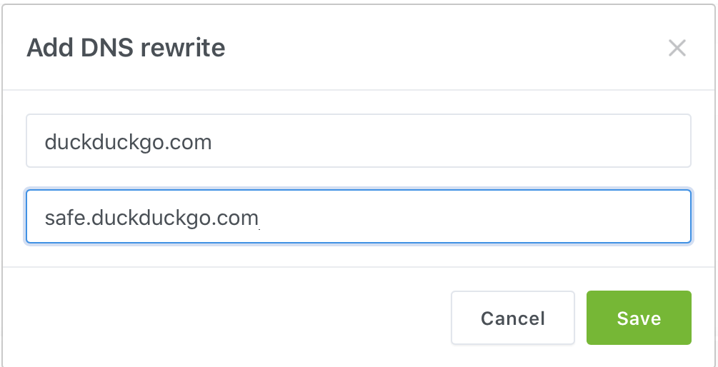 AGH 0.99.2, VPS Debian 9. I added a CNAME safe.duckduckgo.com entry for the duckduckgo.com root domain: