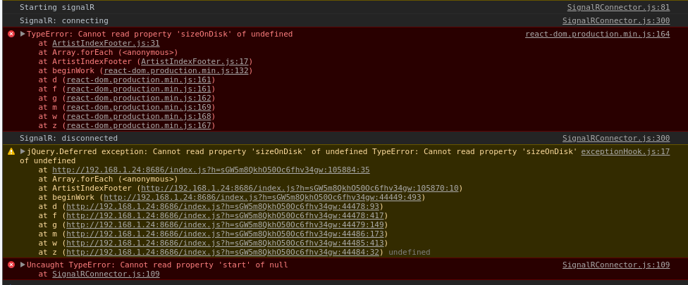 Hopefully 94cca69 fixes this. Can you test build 301Nope, that doesn't work. Same problem, same errors, same empty artists page.