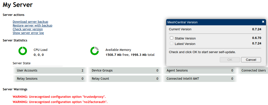 "cookieipcheck": falsein the domain section.The trusted proxy line needs to include all of the internal IP addresses of you load balancer(s). This will indicate to MeshCentral that it's safe to parse the extra HTTP headers in these requests and your load balancers will likely tell MeshCentral what the original IP address of the request was. As, you will start seeing the actual IP address of the request, not the address of your load balancers. Let me know if that helps.