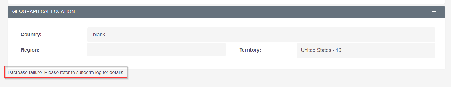 Thu Jun 27 14:27:38 2019 [22600][ce4dc1fc-9c02-bea0-8432-5cc2f80b9f15][FATAL] Exception in Controller: Database failure. Please refer to suitecrm.log for details.