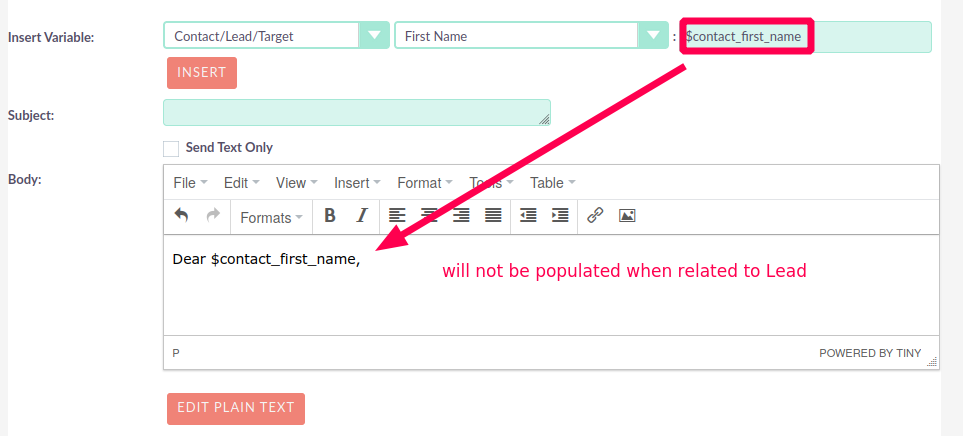 When editing email templates, users can use Contact / Lead / Target variables (which generates variables like $contact_*).