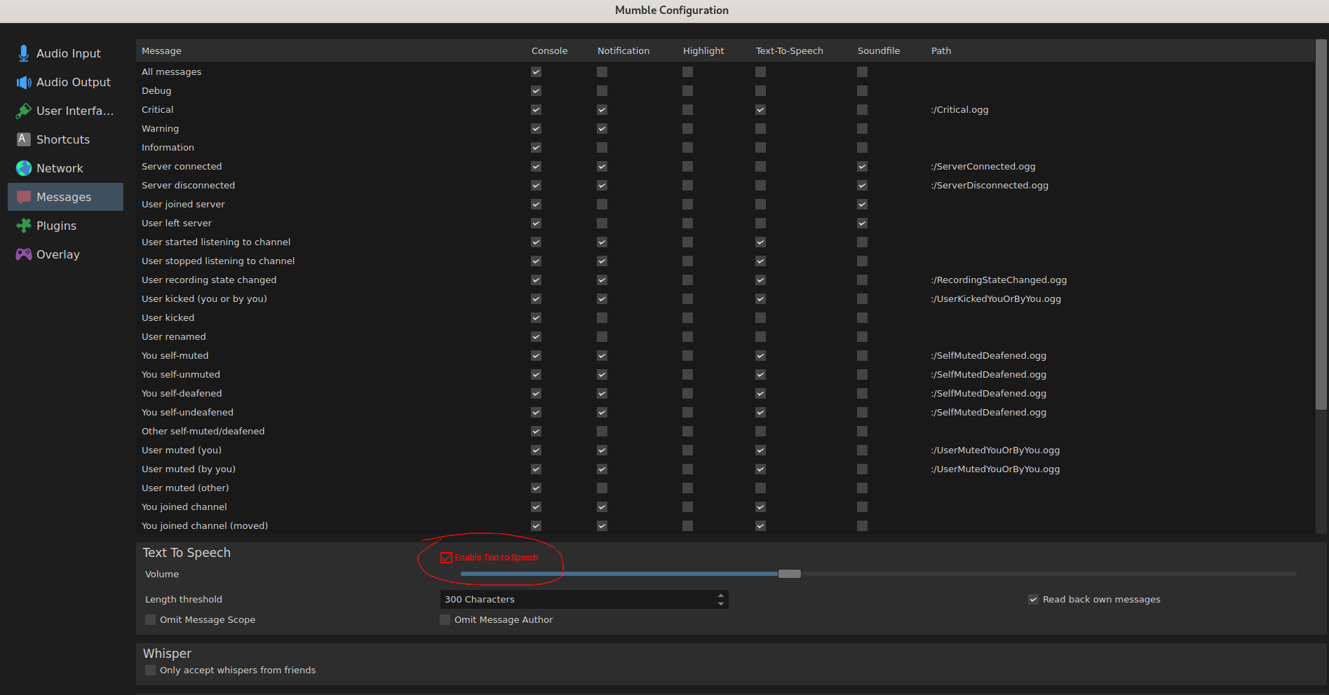 Since text-to-speech is now disabled by default, it's not intuitive for the user to re-enable it. Ordinarily, I would click the configure-mumble/settings icon in mumble client and then fiddle around with the text-to-speech settings for awhile trying to get it to work. It took me forever to realize, I had to enable it by going to the mumble ribbon, selecting configure and then checking the text-to-speech status on. If I were to make a suggestion, place a text label/text box indicating the status of text-to-speech feature right above where you can adjust the volume of TTS using the slider. Somewhere around there in the frame of those settings? Or a check-box to enable text to speech within the mumble configuration -> Messages -> Text-to-Speech settings without having to do it from the ribbon.