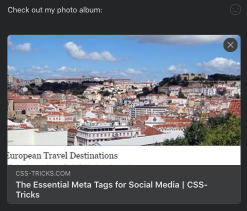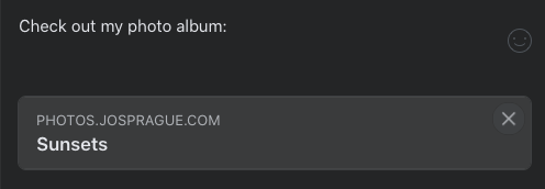 og:image, andtwitter:imagemeta tags would go a long way to making albums more shareable on social media, even if the URL of these tags is just the first image in the album as a first step. Then sharing on social media would look more like this:Here's a quick explanation of how these meta tags work: https://css-tricks.com/essential-meta-tags-social-media/
