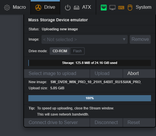 PiKVM is connected via WiFi. I tried to upload a 5GB ISO file. The file upload bar filled up after 5 seconds, but the upload process continued.
