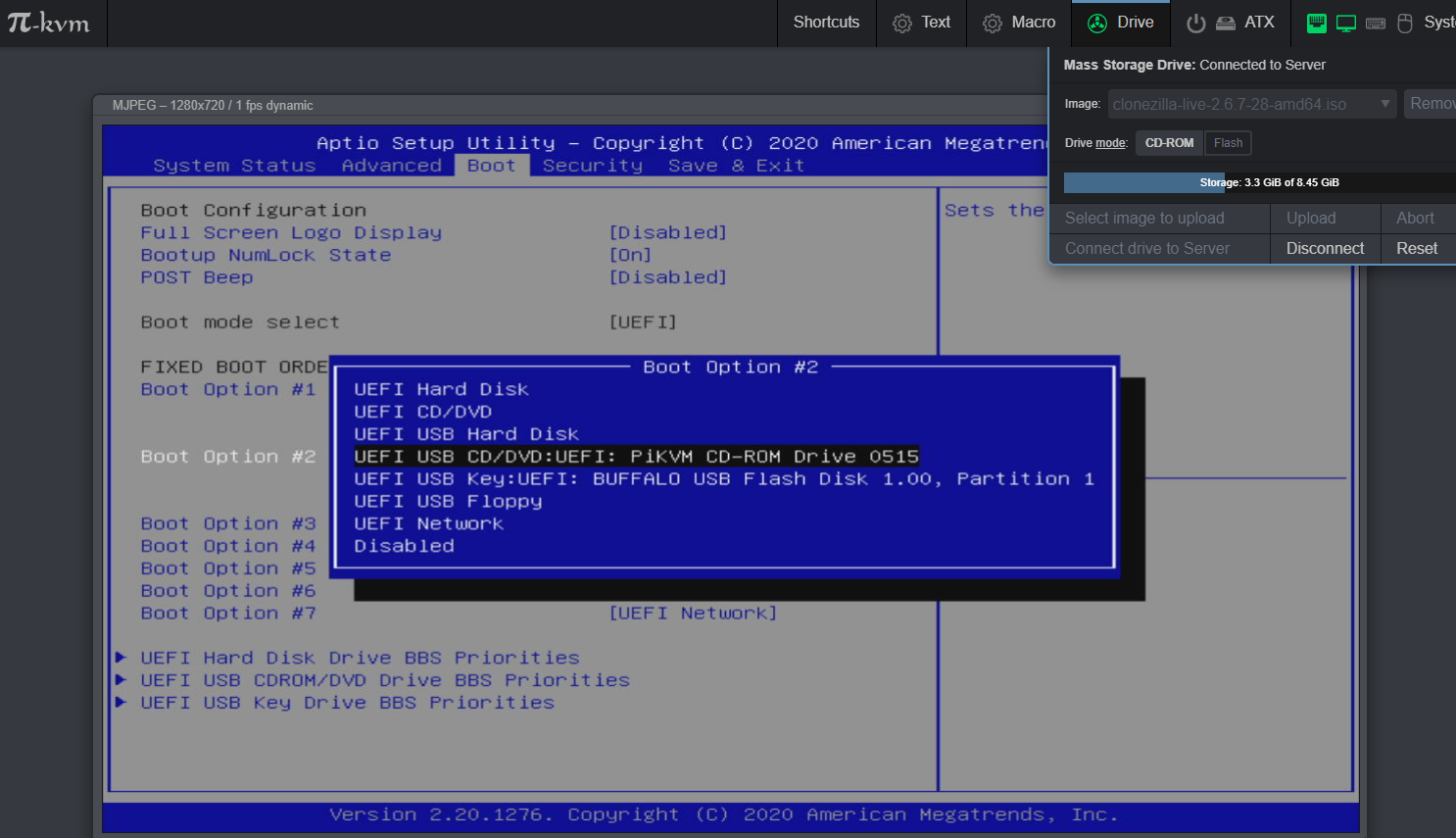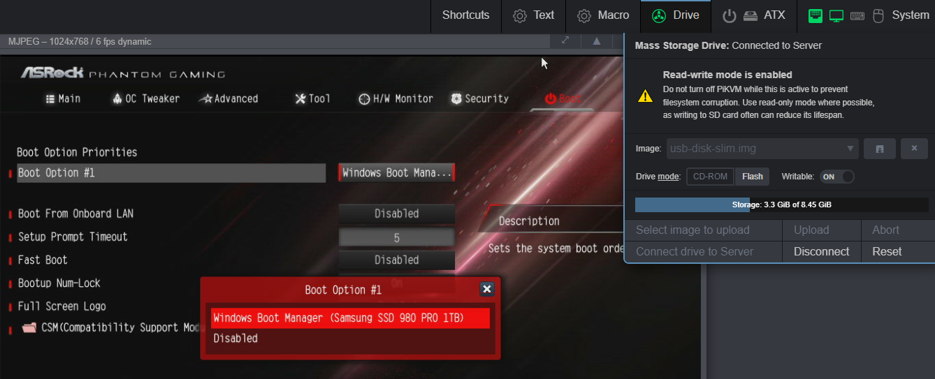And, boot mode selected Legacy + UEFI, then PiKVM CDROM appeared.