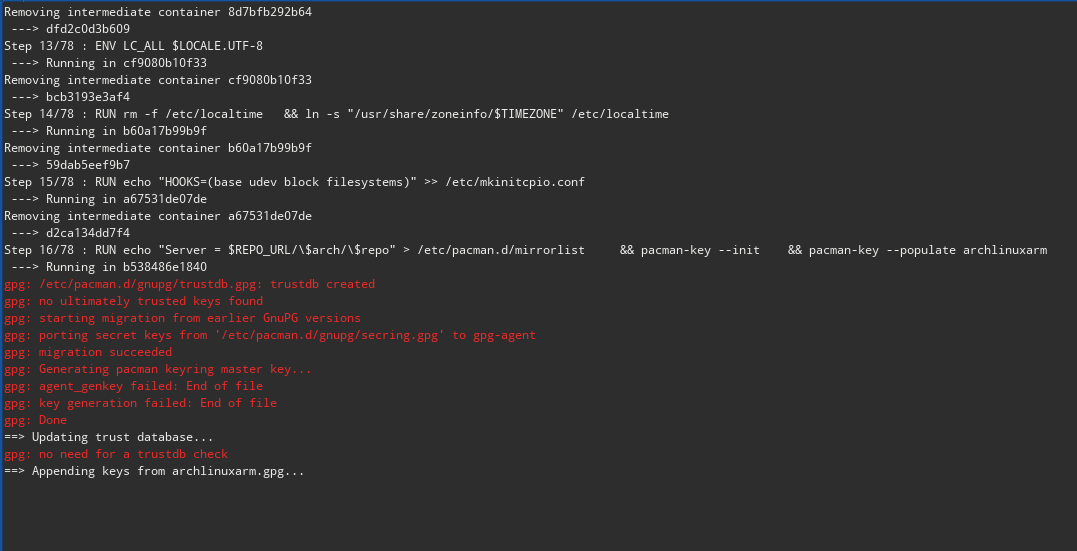 docker execto see what was running in it, and it seemed to be stuck on a pacman command. Maybe Pacman is asking something and it's waiting for input?Is there a way to run the