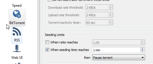 Tools → Options → BitTorrent → Seeding Limits → When seeding time reaches
