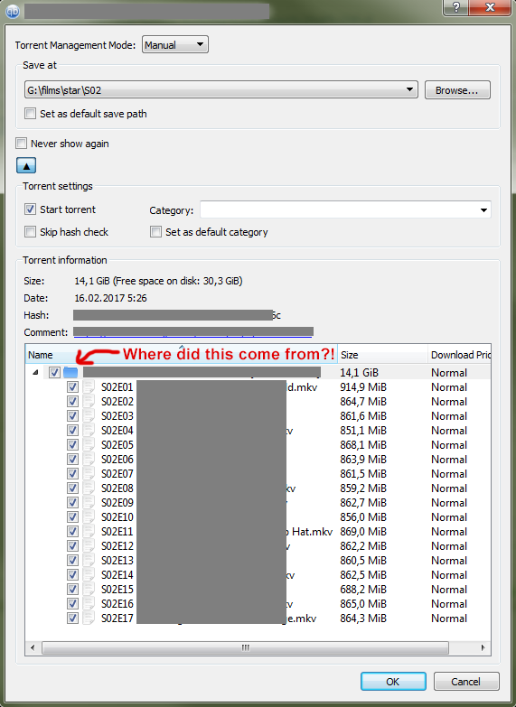 But when I open same torrent in qBittorrent and try to continue seeding these files, it will not agree to set download location as G:\films\star\S02\file#1.mkv, it sets it as G:\films\star\S02\torrentname\file#1.mkv, making whole new folder that wasn't in the torrent before: