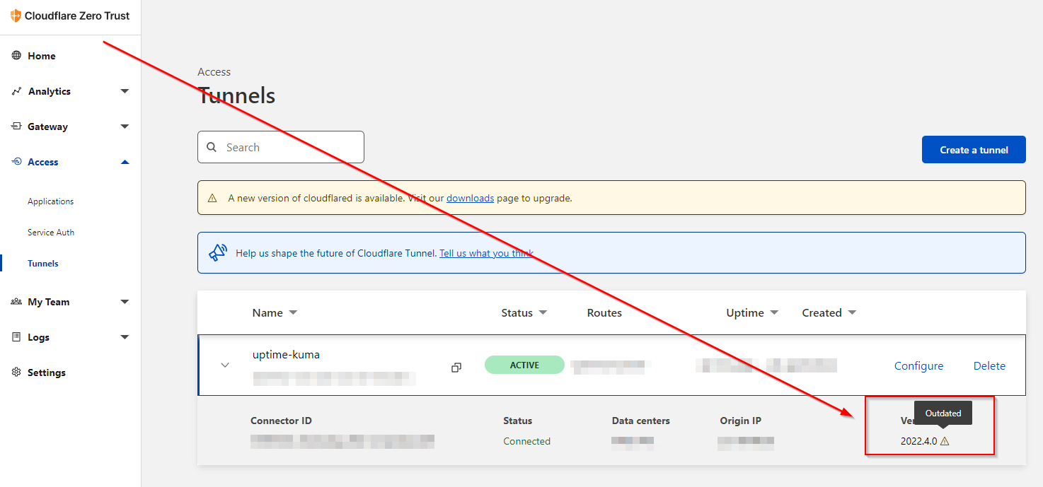 After activating the Cloudflare tunnels, it show in the Cloudflare interface that the client is outdated