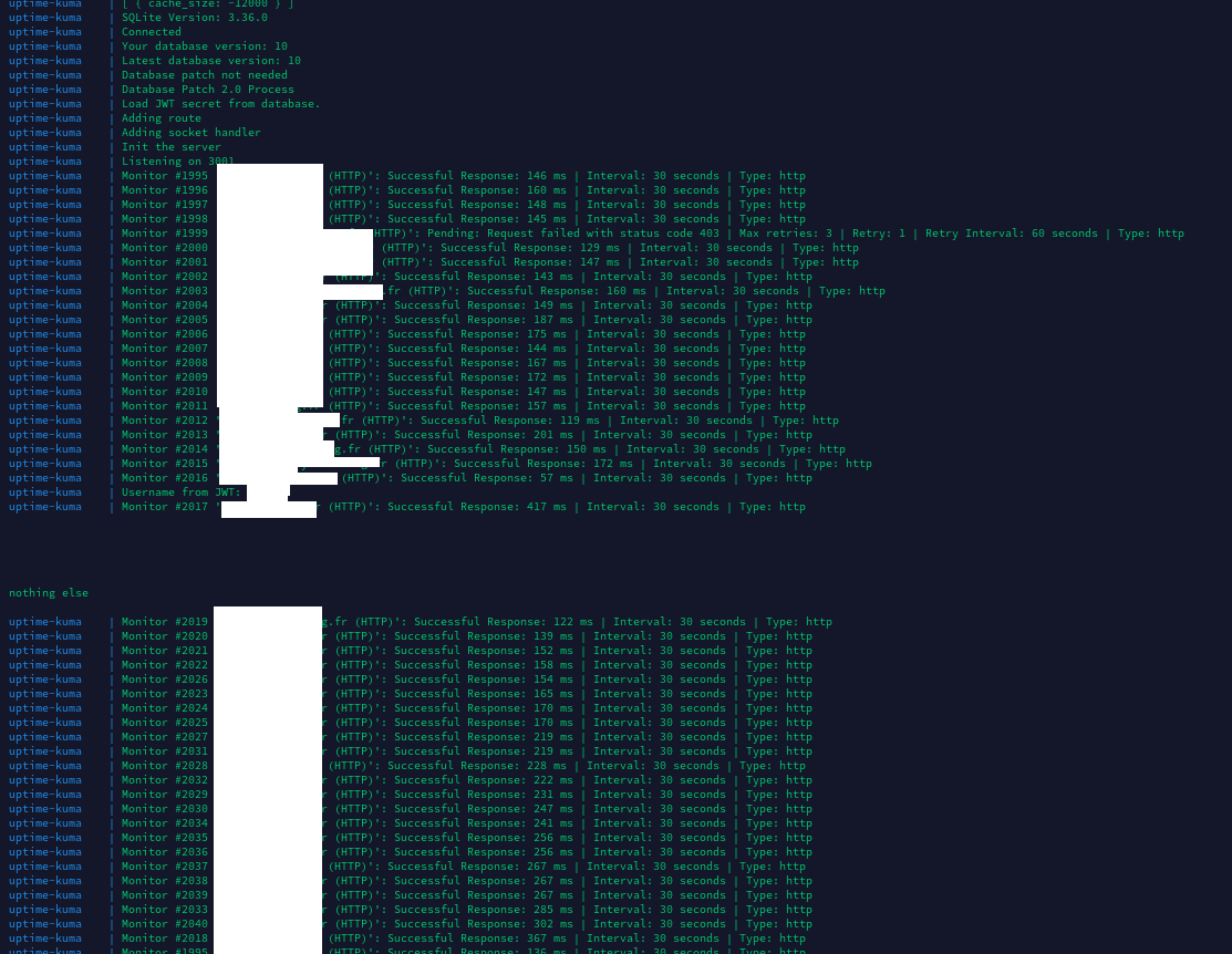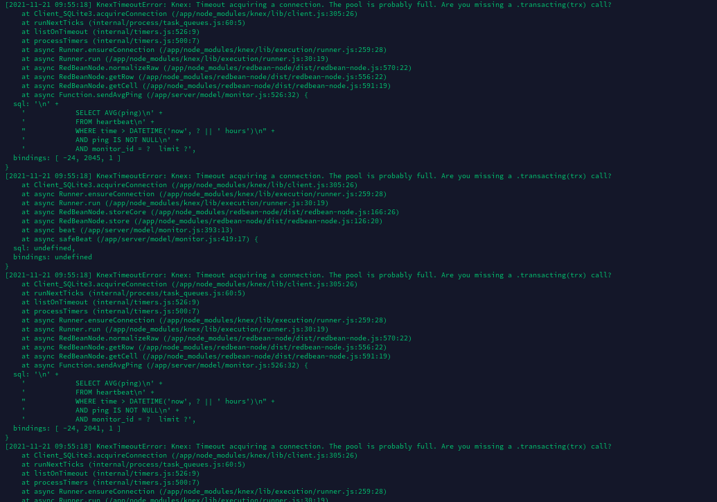 docker-compose up.The strange thing is this error dissapears after stopping the container, and running the up command again. The Uptime Kuma still shows and empty dashboard (0 up / down). In my setup there are around 200 sites which are being monitored.