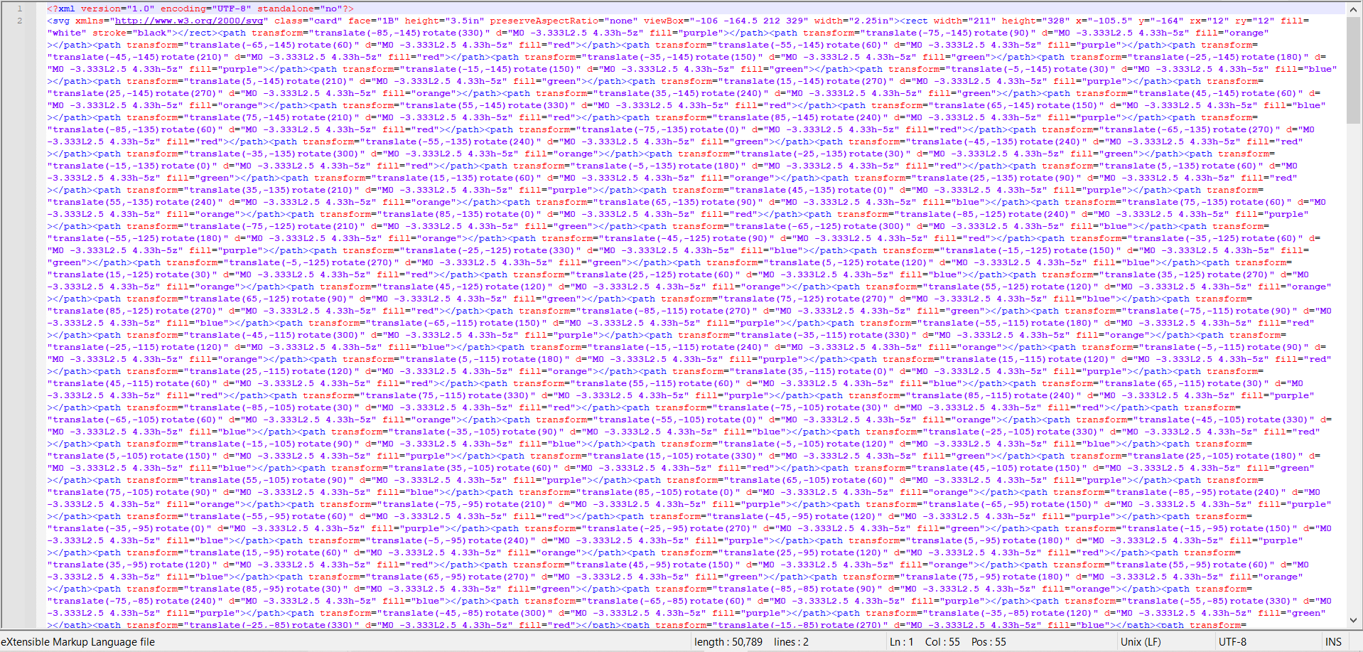 The XML file for the default deck card back looks really complicated with a bunch of transform/translate instructions. It seems to cause a minor lag when cards are pulled from a deck. Below shows about 1/5th of the xml. I suggest we create a less-complicated svg for the default deck, and possibly even replace the current file with it.