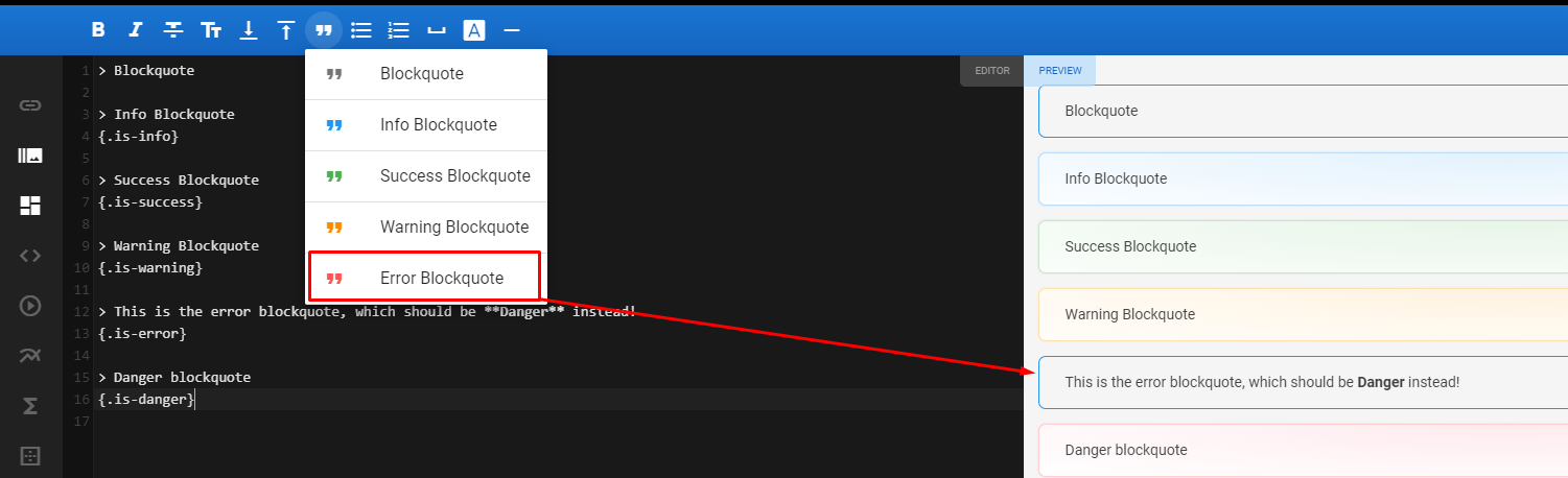 Markdown editor Toolbar has several in-built styles for blockquotes. An Error blockqoute has incorrect {.is-error} style instead of {.is-danger}